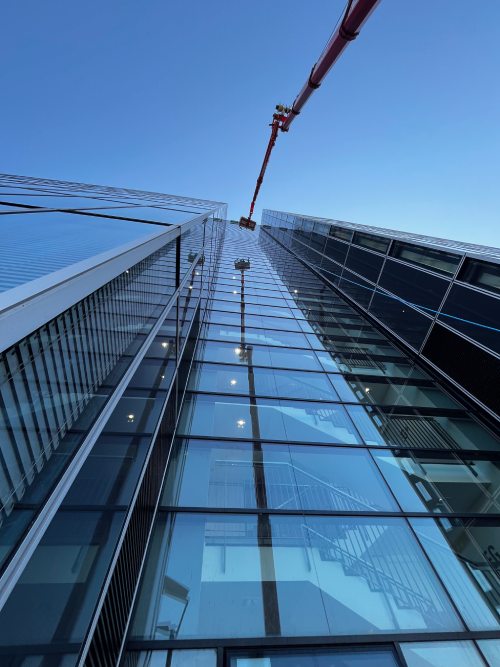 Wir reinigen auch mit entmineralisiertem Leitungswasser ganz ohne Chemie und ohne Arbeitsbühne bis 20 Meter Höhe – Die Umweltschonende Alternative zu unserer gewöhnlichen Glasfassaden und Jalousien Reinigung